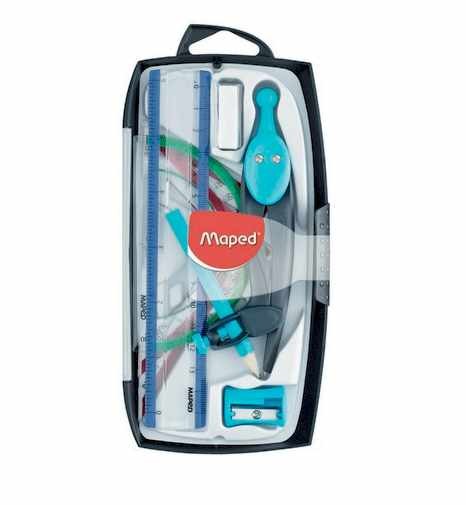 - Compass, sharpener, eraser, pencil, ruler, 2 set squares & protractor.